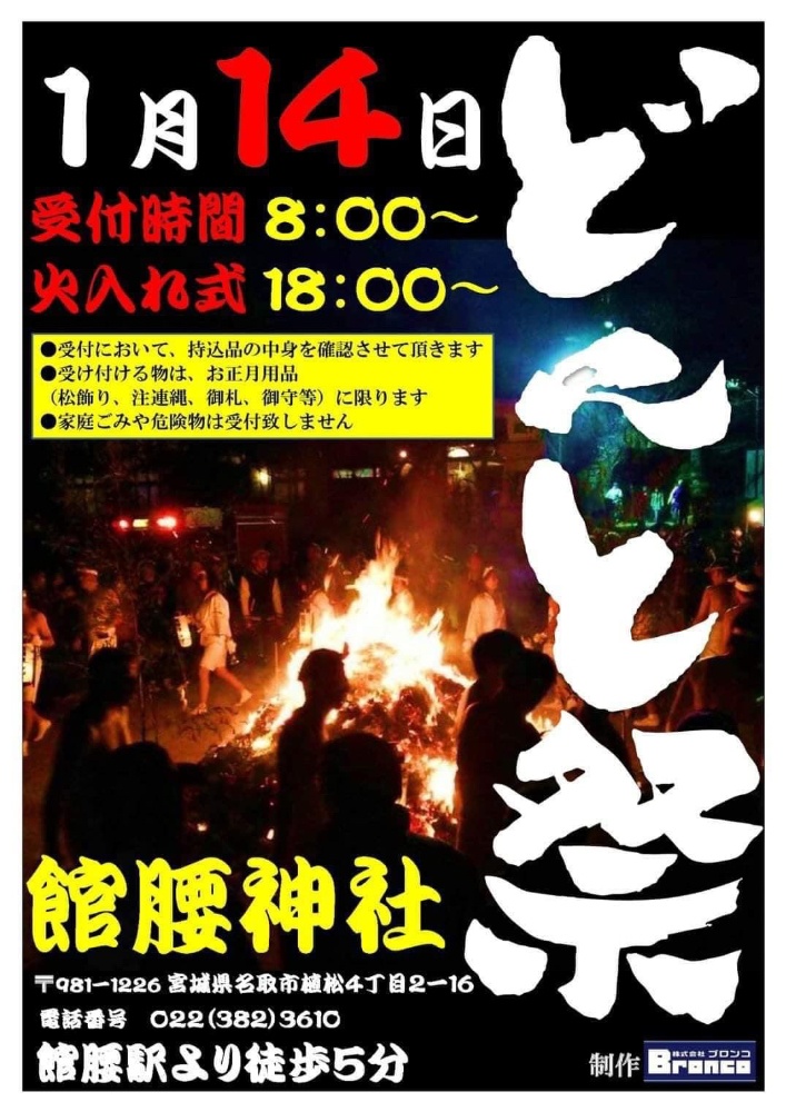 館腰神社境内にて1月14日午前9時より受付を開始し午後18時に火入れ式が執り行われます。