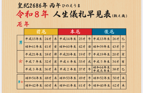 男性前厄 平成15年24才 本厄 平成14年25才 後厄 平成13年26才前厄 昭和61年41才本厄 昭和60年42才後厄 昭和59年43才女性前厄 平成21年18才本厄 平成20年19才後厄 平成19年20才前厄 平成7年32才本厄 平成6年33才後厄 平成5年34才前厄 平成3年36才本厄 平成2年37才後厄 昭和64年平成元年38才男女共通昭和53年49才昭和41年61才※年齢は数え年になります。