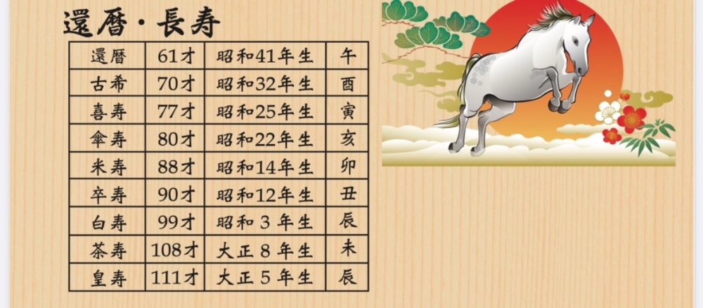 還暦・・・昭和41年生(61才)古希・・・昭和32年生(70才)喜寿・・・昭和25年生(77才)傘寿・・・昭和22年生(80才)米寿・・・昭和14年生(88才)卒寿・・・昭和12年生(90才)白寿・・・昭和3年生(99才) 上寿・・・昭和2年生(100才)年齢は数え歳になります。